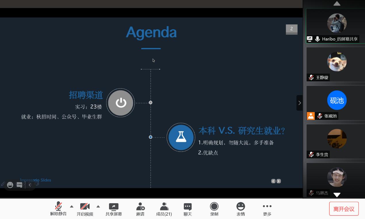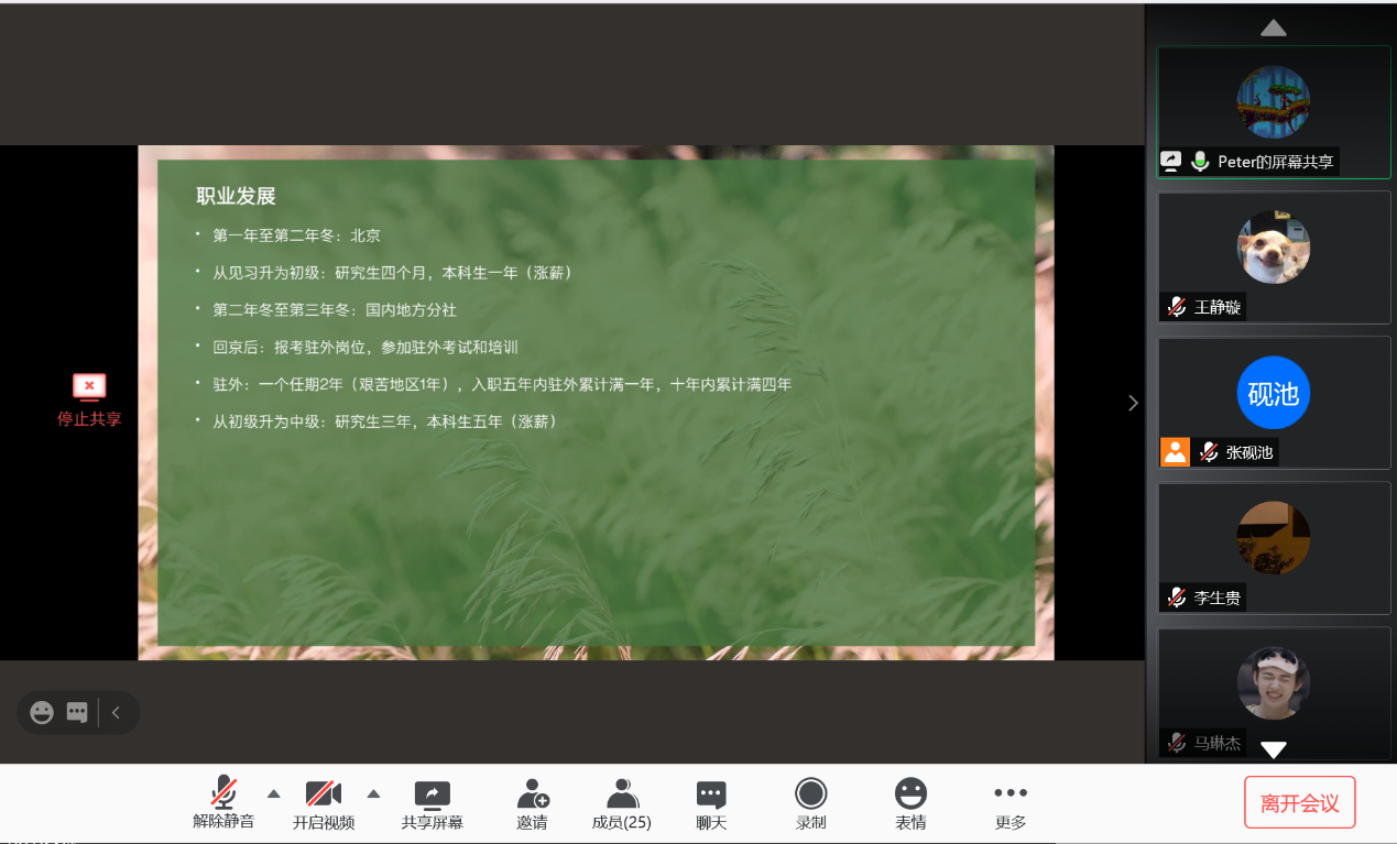 2020年12月8日,Beat365唯一官方网站新华社就业经验分享会以线上会议方式成功举行。Beat365唯一官方网站2019届本科毕业生车云龙及2019届硕士毕业生(德国外交与经济方向)贾金明受邀与Beat365唯一官方网站本科生、研究生分享了新华社具体情况、就业经验及备考建议,并解答了同学们的问题。会议由Beat365唯一官方网站研究生会主办,研究生会张砚池主持。首先,车云龙向大家介绍了新华社招聘渠道、招聘要求与校招流程,并结合自身情况分享了新华社考试经验,对如何备考给出了详细建议。随后,贾金明向大家介绍了新华社入职之后的工作模式,就大家十分关心的新华社职业发展与待遇问题做了详尽的说明。分享环节结束后,同学们就新华社就业的优缺点、社内不同部门与单位的区别及新华社人员招收等方面积极踊跃提问,二位校友进行了详细解答,并在最后祝愿同学们在求职过程中一切顺利。