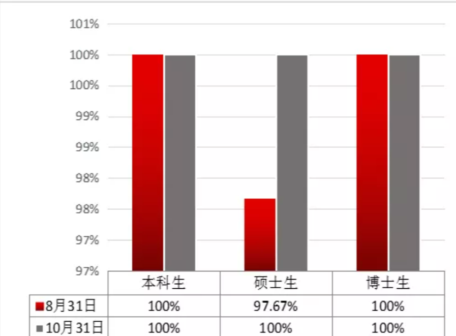 2019-2020学年,在学校党委的正确领导下,Beat365官网认真贯彻落实党中央和学校就业工作要求,探索全员、全方位、全过程的“三全就业模式”,师生同心,群策群力,攻坚就业难题。疫情期间,我们制定“抗疫情、促就业”工作方案,从“稳就业、清意向、扩领域、新方法、推实策、导方向”等六个方面,扎实开展就业工作。截止8月31日,本科生初次就业率为100%,硕博研究生初次就业率为97.67%。截止10月31日,本科生、研究生就业率均为100%,总体就业率为99.57%,居全校第二,比2019年毕业生就业率提升了15.26%。