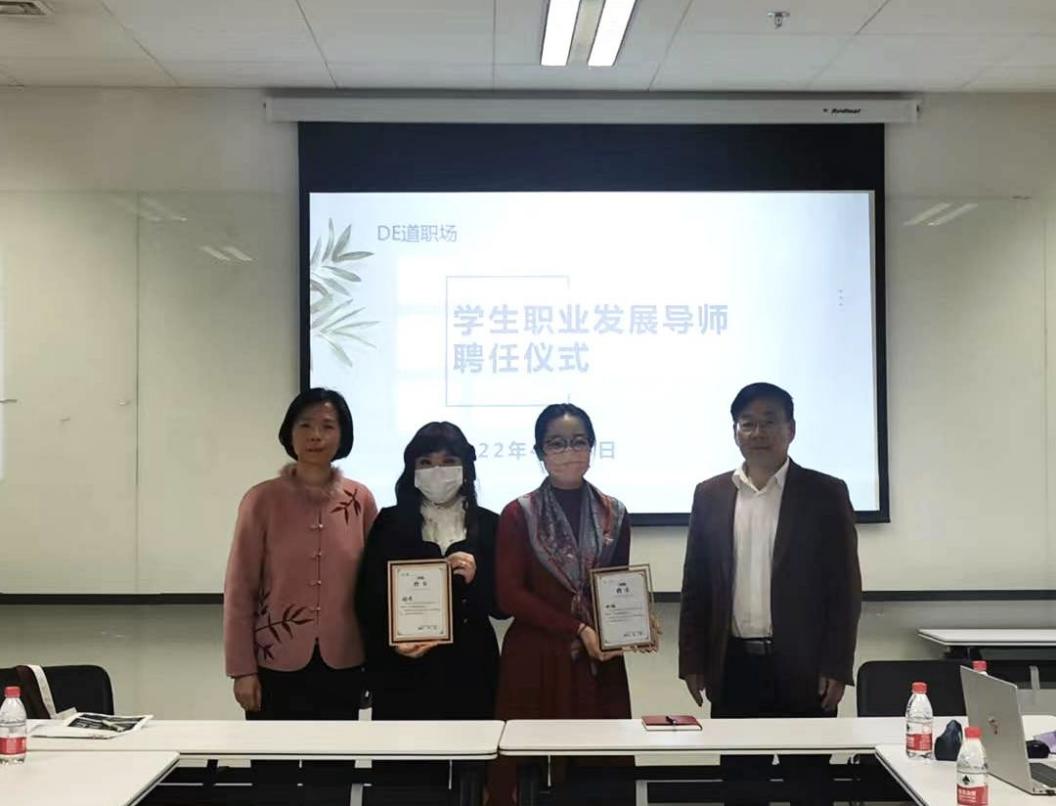 致辞环节后是DE道职场系列活动之学生职业发展导师聘任仪式。Beat365唯一官方网站党总支书记常秀鹏和党总支副书记、院长吴江分别向两位校友颁发了聘书。“DE道职场——学生职业发展导师”项目拟邀请Beat365唯一官方网站毕业校友回母校或在线为在校生开展就业指导讲座以及一对一就业咨询,旨在整合校友资源、增进在校生与校友沟通,促进Beat365唯一官方网站学生职业发展。