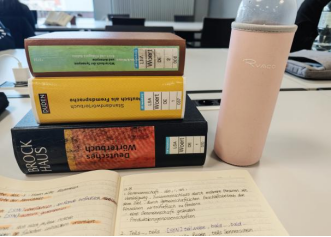在知识的探求上,我在海德堡遇到了一些“纯粹”的人,他们对知识的探求非常热烈,也让我对知识的追求更加纯粹和真诚。从前的我读德语原版书,遇到生僻词汇或复杂句式,容易失去耐心,习惯性地跳过。而现在,我可以抱着一本厚重的德德词典和一本同反义词词典,在图书馆安静地待上一整天。遇到生词我就查阅它的德语释义,如果仍没有看懂,就再查它的近义词或者反义词,我试着把每个词都慢慢弄懂,慢慢理解。可能一两个小时只能厘清楚一句话,这个过程看似缓慢,我却感到无比充实,因为我的词汇网络正在不断延伸,知识也随着时间一分一秒地落进我的脑海里,悄悄扎根,不断蔓延。吃饭的时候我会把自己学到的词汇讲给同学听,教学相长,说出来之后,我的记忆也更加深刻。