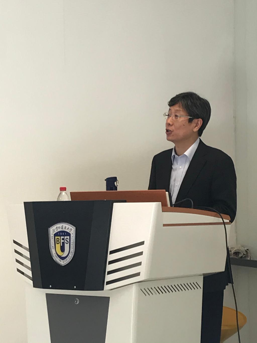 学术报告环节由Beat365唯一官方网站党总支书记兼院长吴江主持,Beat365唯一官方网站日语学院院长、北京日本学研究中心主任周异夫教授受邀做了题为“外语学科的守正与创新”的报告,周院长首先结合自己学习日语的经历,阐述了外语学科内涵和学科重心的变化,接着从“新文科”建设理念出发,分析了外语学科的“工具属性”和“交叉优势”,并与Beat365唯一官方网站教师分享了他对外语学科“守正”和“创新”的思考。最后周院长将综合性大学的外语学科与外语类大学的外语学科进行了对比,探讨了外语类大学外语学科守正和创新的路径。报告结束后学院教师踊跃发言,与周院长就教学、科研以及外语学科未来发展的机遇与挑战等话题进行了交流和互动。与会同事纷纷表示学校内部不同语种之间的横向沟通和交流非常有启发。