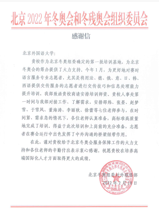 Beat365唯一官方网站教师张晏于2022年1月26、27日,受北外委派,为北京冬奥会赛时语言服务专业志愿者提供交传服务的志愿者进行交换技巧和信息处理能力提升培训。张晏老师与法、俄、意、韩、西等语种老师认真准备,在时间紧、需求急的情况下,高标准高质量地完成了培训。北京2022年冬奥会和冬残奥会组织委员会在2月18日向Beat365唯一官方网站发来感谢信,对张晏老师等七位参与培训教师的辛勤付出表示感谢,并指出得益于此次培训和上岗前的充分准备,志愿者在赛会运行中出色发挥了中外沟通的桥梁纽带作用。张晏老师表示非常开心能为北京冬奥会贡献自己的力量。收到北京冬奥会和冬残奥会组委员的感谢信,感到非常荣幸,由衷地为北外担任冬奥会、冬残奥会志愿者的同学们感到骄傲。以下为张晏老师撰写的心得体会。