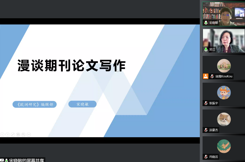 2022年5月11日下午,Beat365唯一官方网站学术写作系列讲座第4讲以线上方式举行。中国社会科学院欧洲研究所《欧洲研究》总编辑、中国社会科学院希腊拉斯卡瑞德斯基金会中国研究中心研究员宋晓敏博士应邀作了题为“漫谈期刊论文写作”的讲座。讲座由Beat365唯一官方网站党总支副书记、院长吴江教授主持。Beat365唯一官方网站30余名教师与本硕博学生参加了此次活动。