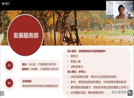 研究生会轮值主席任心语及研究生会主要成员介绍了办公室、学术文体部以及发展服务部三个部门的具体工作内容,并积极邀请新生加入研会大家庭。