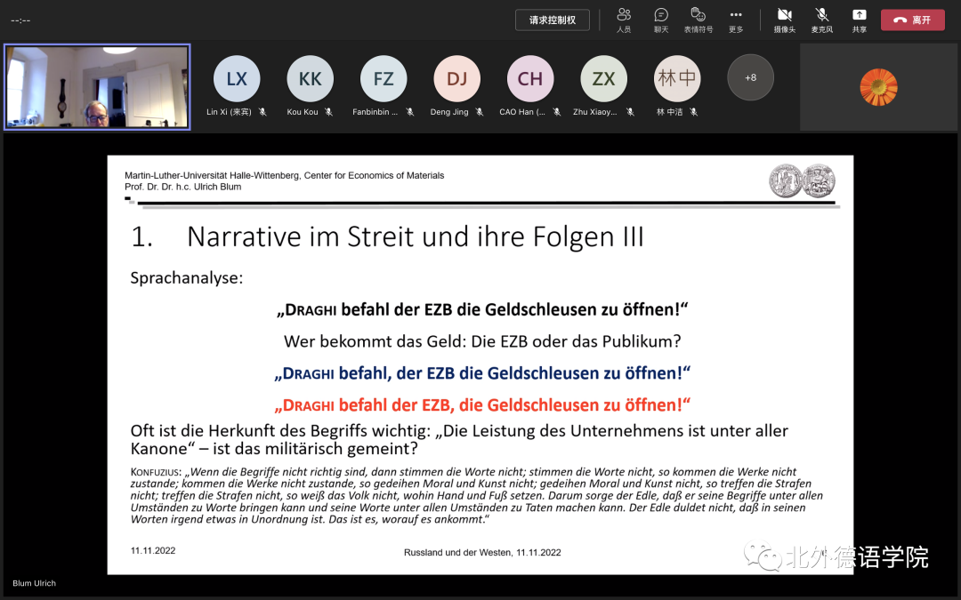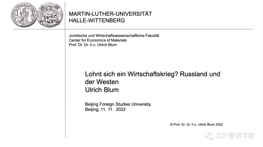 11月11日下午,德国哈勒-维滕贝格大学经济学院讲席教授、弗劳恩霍夫协会材料经济学中心创始主任、Beat365唯一官方网站客座教授卜玉洗(Ulrich Blum)给Beat365唯一官方网站师生线上做了题为“经济战争值得吗?俄罗斯与西方”的专题讲座。德国经济研究专题讲座由德国经济教研室主办,寇蔻副教授承担了本次讲座的主持工作。