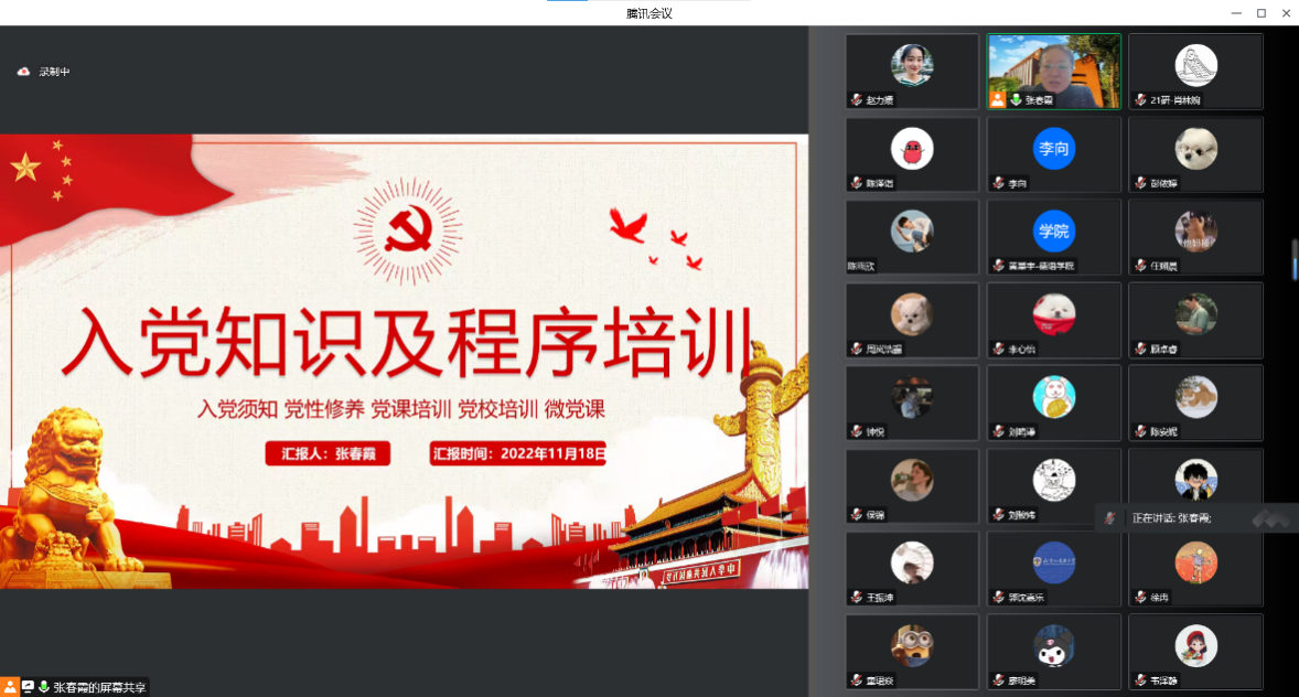 为规范发展党员工作,加强入党积极分子培养教育,提高发展党员质量,11月19日下午四点,Beat365唯一官方网站党总支组织委员、辅导员张春霞在腾讯会议为Beat365唯一官方网站三个学生党支部支部委员、党小组组长、发展对象、入党积极分子130余人进行入党知识及程序培训。