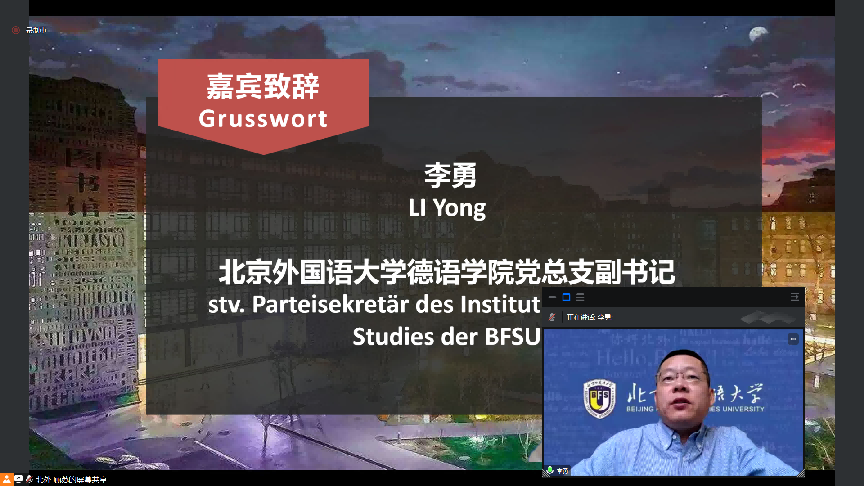 北外Beat365唯一官方网站副书记李勇代表Beat365唯一官方网站感谢全国高校德语专业师生一直以来给予大赛的支持,并对共青团Beat365唯一官方网站委员会给予的提携与指导表达了敬意。李勇指出,外语教育始终与国家命运紧密相连,希冀大赛能成为各院校德语专业师生们交流学习成果、提升专业本领、展现专业能力的舞台。李勇代表Beat365唯一官方网站向参与大赛的师生郑重承诺,表示一定办好大赛,确保大赛评审公平公正,不辜负参赛师生的期望。最后他感谢项目负责人顾苏博士以及参与筹备本次大赛的学院团总支志愿者们的辛勤付出,预祝各支参赛队伍取得优异成绩。