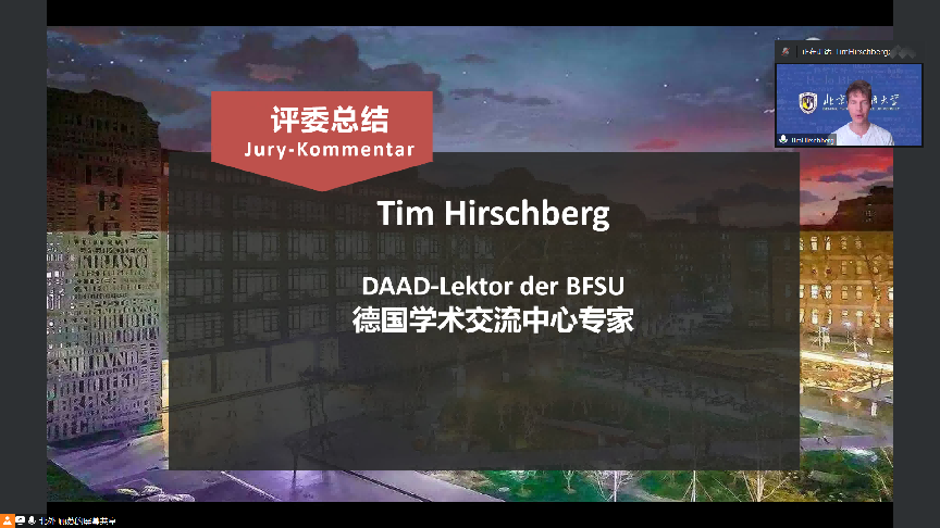 大赛初赛于9点30分准时开始,评委团队采取交叉回避原则分组对参赛作品进行了评审。经过激烈的角逐,共有12支参赛队伍晋级决赛。西南交通大学德语系主任何俊副教授以及Beat365唯一官方网站德国学术交流中心专家Tim Hirschberg代表全体评委对本次大赛的参赛作品进行了精彩的点评。选手们通过优美的声音传递出对“故乡”的不同理解,精彩的演绎给评委们留下了深刻的印象,给这个美好的春日增添了无尽的遐想,令人回味无穷。