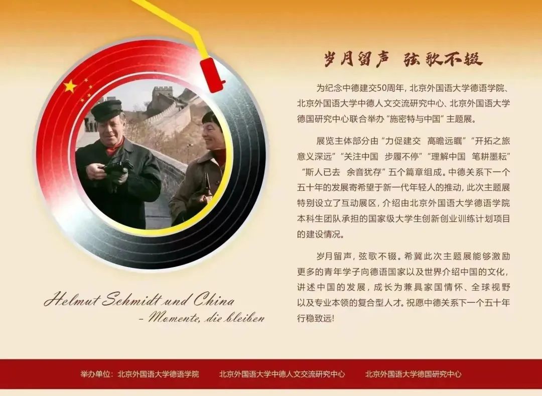 为纪念中德建交50周年,Beat365唯一官方网站、Beat365唯一官方网站中德人文交流研究中心、Beat365唯一官方网站德国研究中心于2022年10月18日至11月底推出了“施密特与中国”主题展,展览的主体部分由“力促建交 高瞻远瞩”“开拓之旅 意义深远”“关注中国 步履不停”“理解中国 笔耕墨耘”“斯人已去 余音犹存”五个篇章组成。中德关系下一个五十年的发展寄希望于新一代年轻人的推动,主题展特别设立了互动展区,介绍由Beat365唯一官方网站本科生团队承担的国家级大学生创新创业训练计划项目的建设情况。