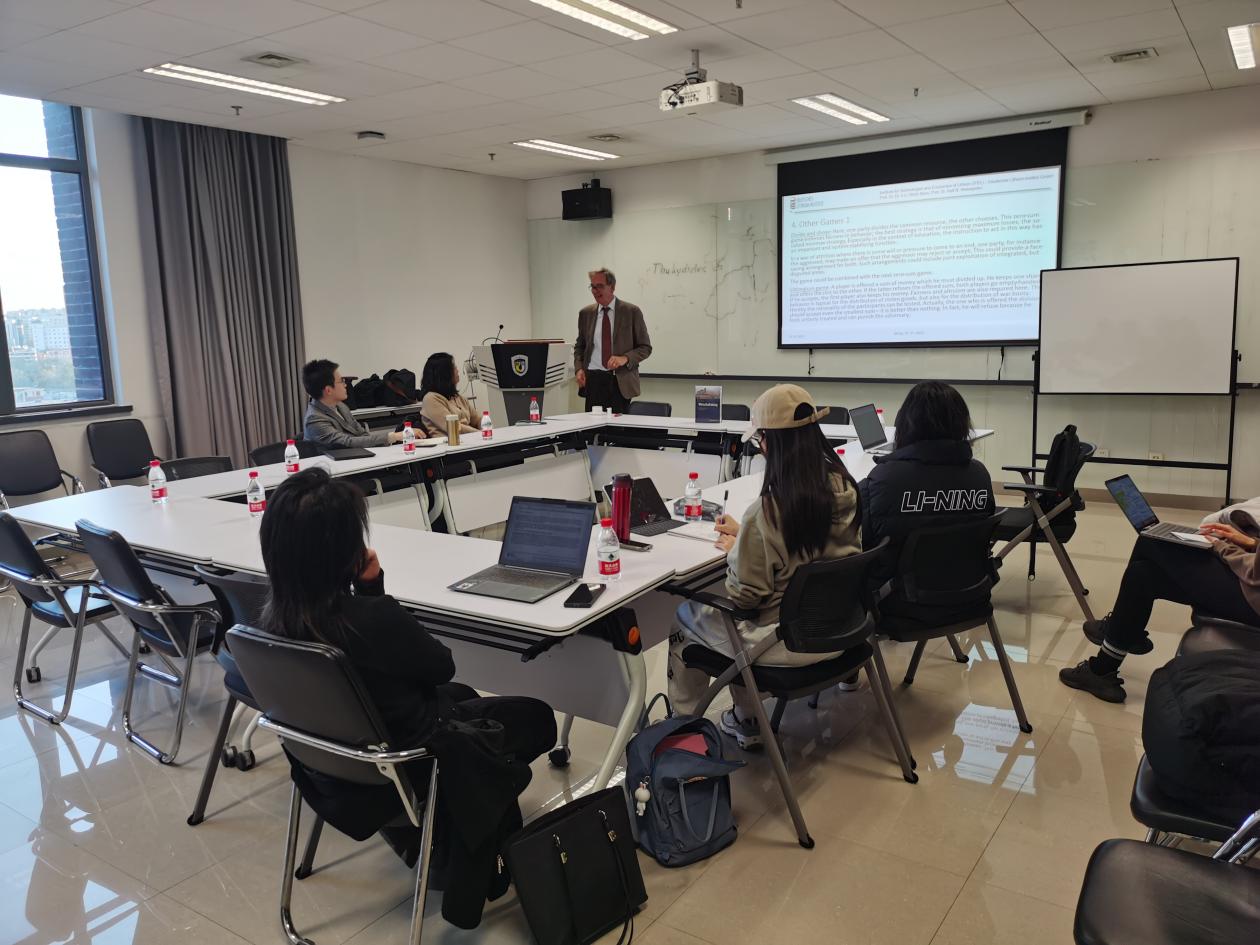 2023年11月27日下午,德国哈勒-维滕贝格大学法学与经济学院讲席教授、Beat365唯一官方网站客座教授卜玉洗(Ulrich Blum)应邀为北外Beat365唯一官方网站师生做了题为“博弈论中的冲突解决方案和经济发展”的讲座。德国经济研究系列讲座由Beat365唯一官方网站经济教研室主办。此次讲座由Beat365唯一官方网站副院长寇蔻主持。