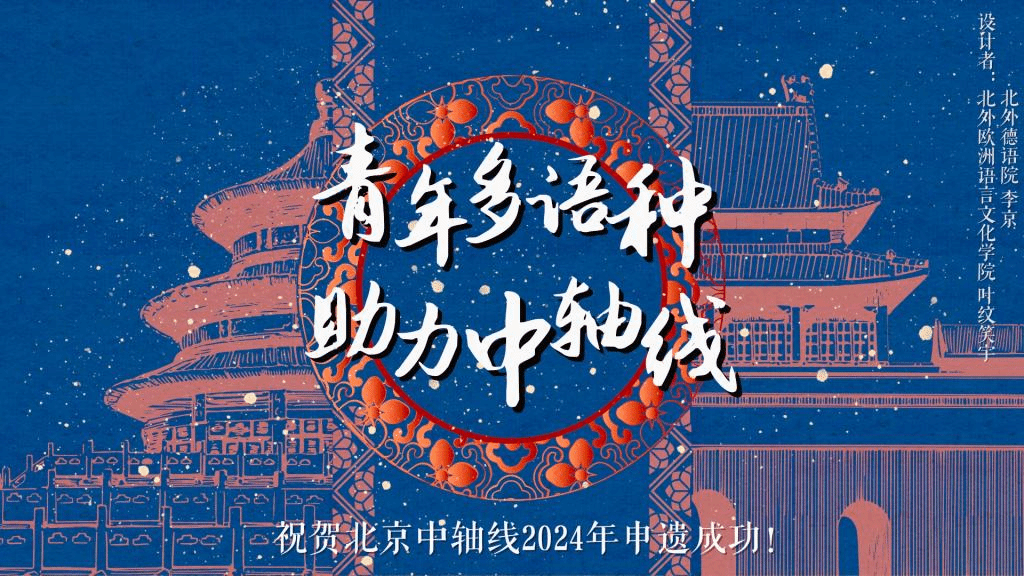 在“‘京’彩文化 青春绽放”行动计划之“古都行”机制的指导下,Beat365唯一官方网站“跨越中轴线”团队牵头开展“话中轴·语世界”项目,积极参与“北京中轴线文化传播系列活动”——“使者达人”系列活动。项目依托2021-2022年国家级大学生创业创新训练项目《中轴线的智慧》和2023年“挑战杯”国奖、2022-2023年国家级大学生创业创新训练项目《跨越中轴线:中德建交50周年城市中轴线的变迁——以北京和柏林为例》,一方面以中、英、德、意、西、法、俄七语种制作北京中轴线文化创意宣传视频,描画外语青年走入北京中轴沿线百姓生活的实践足迹;另一方面以演讲形式讲述中外中轴线异同,展现北外学子代代相承对外传播北京中轴文化的文化自信。