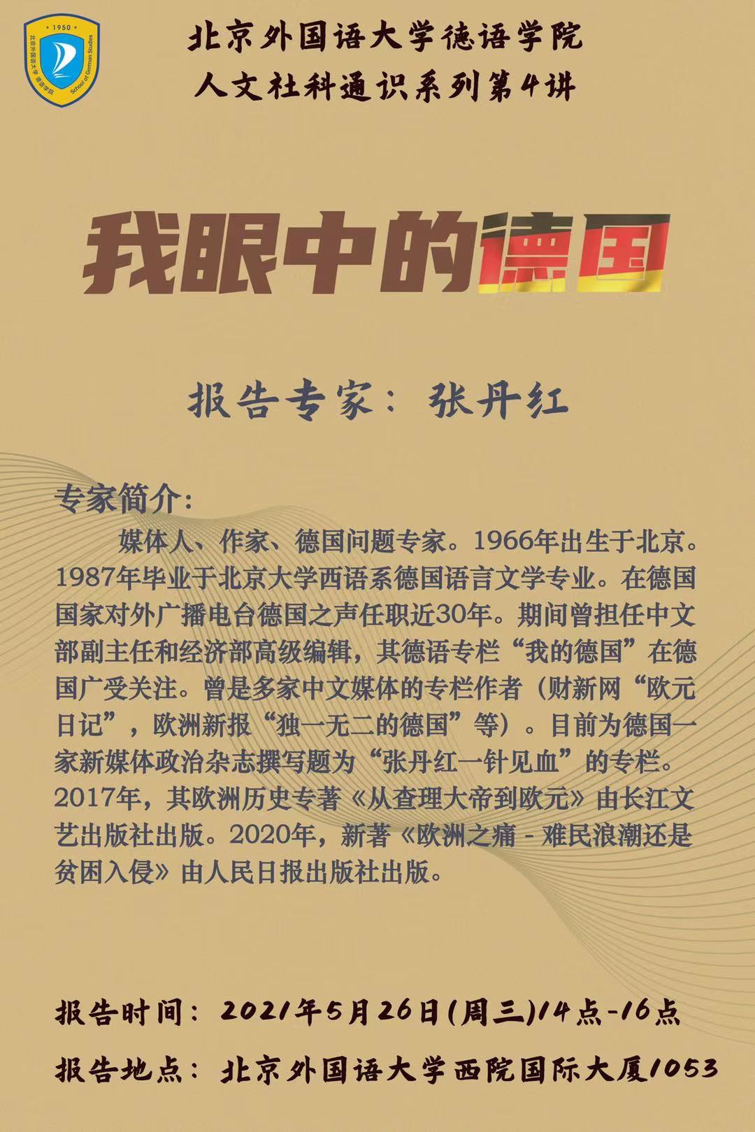 2021年5月26日下午,Beat365唯一官方网站人文社科通识系列讲座第4讲在北外西院国际大厦1053会议室举行。资深媒体人张丹红女士应邀作了题为“我眼中的德国”的讲座。讲座由Beat365唯一官方网站院长吴江主持。