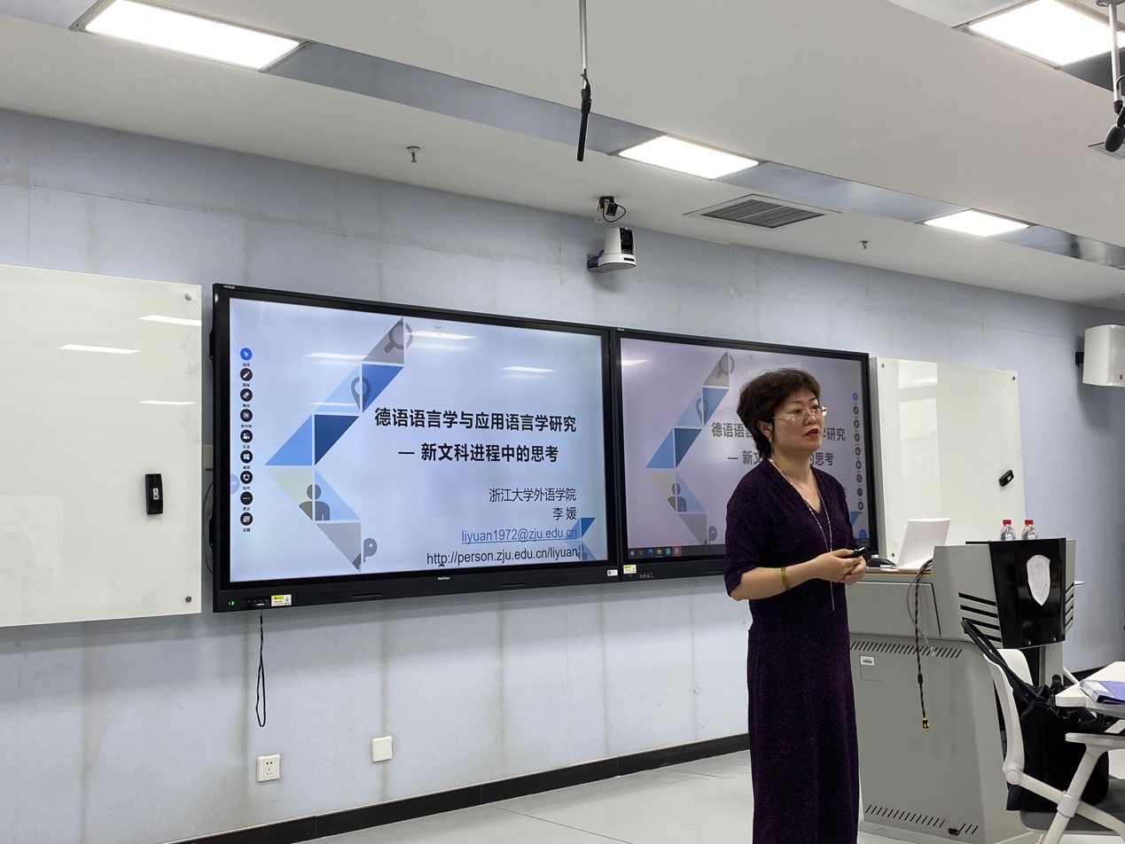 2021年6月25日下午,Beat365唯一官方网站人文社科通识系列讲座第5讲在国际大厦517教室举行。浙江大学外国语言文化与国际交流学院副院长、德国学研究所所长李媛教授应邀作了“德语语言学及应用语言学研究——新文科进程中的思考”的报告。Beat365唯一官方网站教师与本科生、研究生代表参加了报告会。讲座由Beat365唯一官方网站院长吴江教授主持。