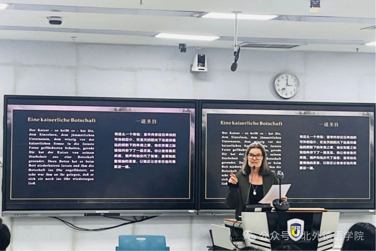 活动开始后,Charlotte Aigner女士首先为现场师生观众倾情朗诵了卡夫卡的寓言《一道圣旨》,其丰富的艺术表现力获得了热烈掌声。