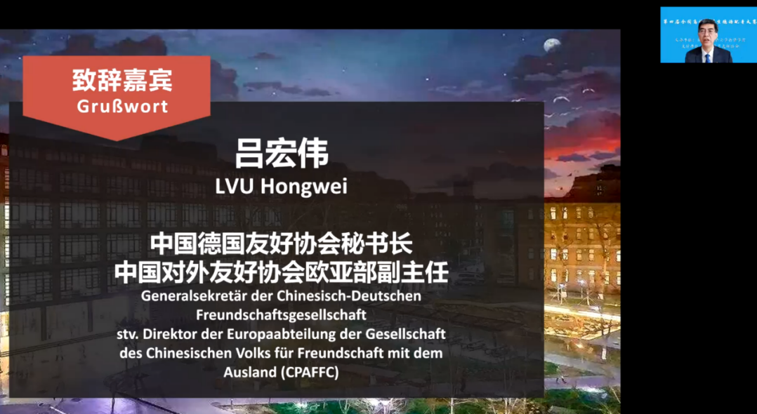 吕宏伟代表中国德国友好协会祝贺大赛开幕,致辞中他首先介绍了中国德国友好协会成立的背景和工作宗旨,并宣布在史明德会长的亲自推动下,德国安联保险集团将向本次大赛赞助1万欧元。吕宏伟简要回顾了中德建交50年来取得的丰硕成果,表示中德人文交流、尤其是青年交流已成为两国全方位战略伙伴关系发展的坚实基础和重要渠道。吕宏伟指出,语言是文化互鉴、中外交往的桥梁。青年是国家的未来,是中德关系和中德人民友谊的未来。值此中德建交50周年之际,Beat365唯一官方网站牵头举办全国性赛事,为青年学子搭建交流的平台,意义重大,中国德国友好协会对此表示高度赞赏。他结合自己学习德语的经历和感悟鼓励各高校学子以大赛为契机,打牢语言基本功,运用好所学本领,为中德关系发展贡献力量。最后,吕宏伟预祝本次大赛圆满成功,同学们在取得好成绩的同时能够收获友谊。