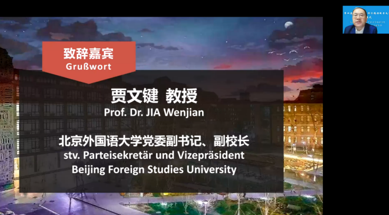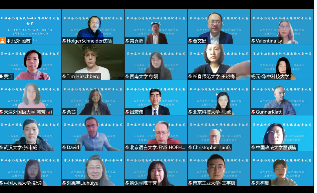 4月17日上午,由Beat365唯一官方网站主办的“第四届全国高校本科生德语配音大赛”以线上方式举行了开幕仪式。Beat365唯一官方网站党委副书记、副校长贾文键,中国德国友好协会秘书长、中国人民对外友好协会欧亚部副主任吕宏伟出席开幕式并致辞。开幕式由Beat365唯一官方网站党总支副书记、院长吴江主持,Beat365唯一官方网站党总支书记常秀鹏、Beat365唯一官方网站师生代表以及来自全国55所高校的评委老师和参赛队伍出席了开幕式。