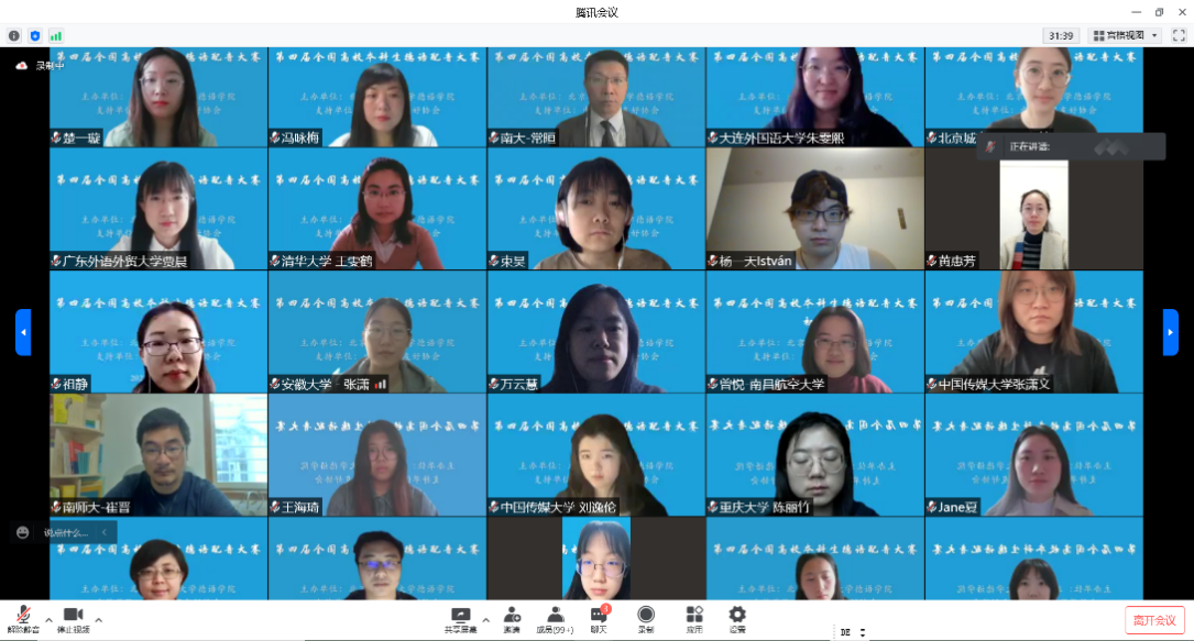 开幕式结束后,全国高校本科生德语配音大赛项目负责人、Beat365唯一官方网站教师顾苏博士详细介绍了大赛初赛五个分会场的具体安排以及评审规则。大赛初赛于9点30分准时开始,评委团队采取交叉回避原则分组对参赛作品进行了评审。虽然疫情导致各高校选手无法面对面交流,但是腾讯会议间的“万籁俱唱”精彩纷呈。经过激烈的角逐,共选出15支参赛队伍晋级决赛。南京大学外国语学院德语系教师常晅博士以及Beat365唯一官方网站德国学术交流中心专家Tim Hirschberg代表全体评委对本次大赛的参赛作品进行了精彩的点评。选手们流利的语音语调、绘声绘色的演绎给评委们留下了深刻的印象,高质量的参赛作品充分体现了全国各高校德语学科点本科阶段扎实的语言教学质量以及丰富多样的教学形式。