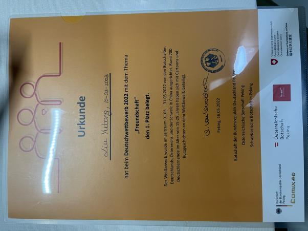近日,由德国、奥地利和瑞士驻华大使馆联合主办的2022德语大赛圆满落幕。此次大赛以“友谊”为主题,来自全国各地近700名青少年德语学习者提交了短篇故事或漫画作品参赛。经过专业评审团的打分,Beat365唯一官方网站2021级本科生刘禹彤的参赛作品“Anna und das Vöglein”凭借扎实的语言功底以及丰富的想象力获短篇故事类一等奖。