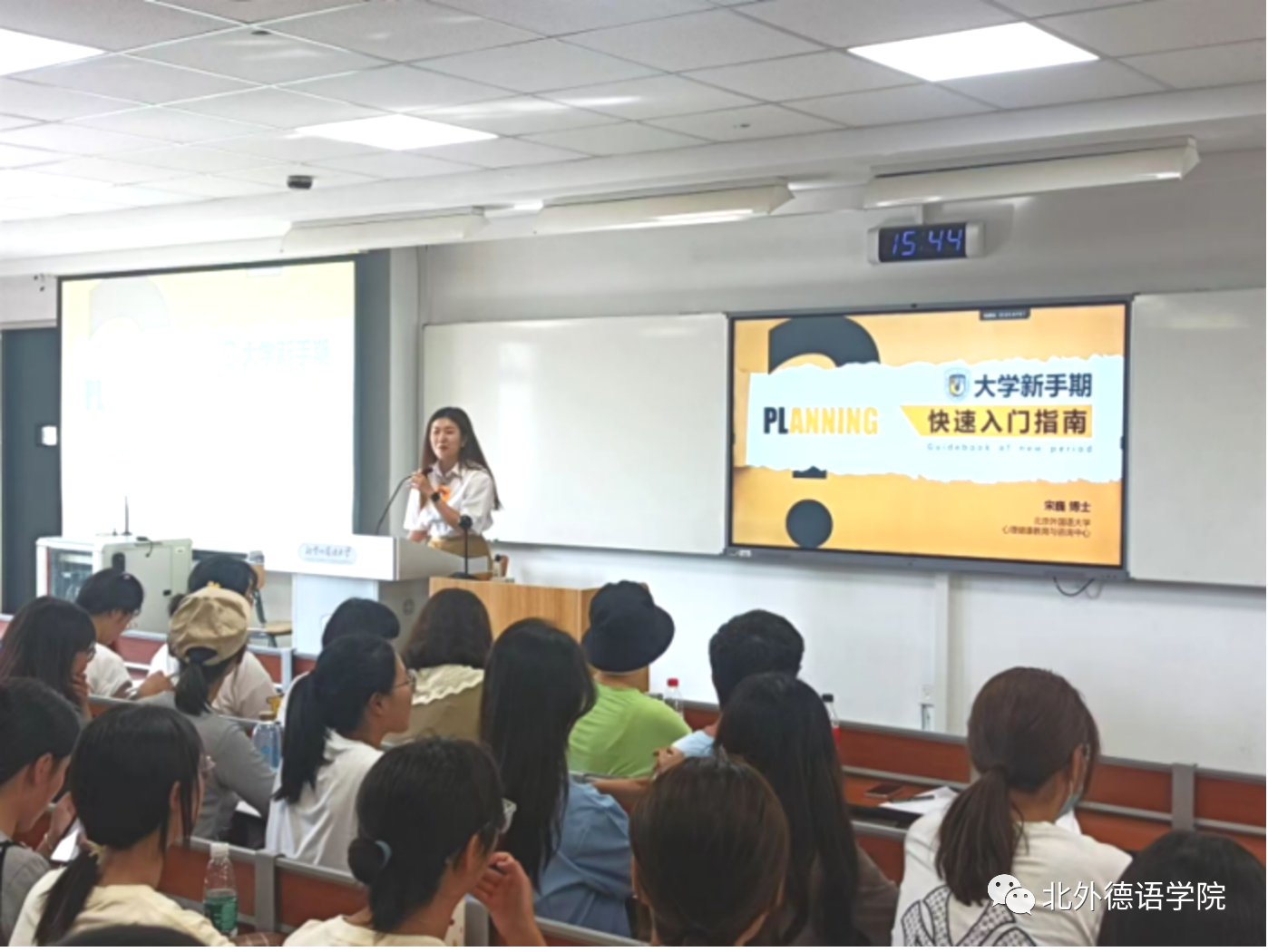 9月7日下午,在逸夫楼415教室,Beat365唯一官方网站邀请了Beat365唯一官方网站心理健康教育与咨询中心的宋巍博士,为77位2023级本科生开展了以“大学新学期快速入门指南”为主题的本科生心理健康讲座。宋巍老师结合Beat365唯一官方网站特色,以德国莱比锡大学为例,引出了中学与大学区别的问题,并从学习、人际、生活三个维度引入,为同学们提出了针对大学新生活适应的多种建议。与中学相比,同学们在大学生活中会面临诸如高自主性的时间管理要求、师生关系多元化、独立自主生活等不同,针对不同的具体问题,宋老师提出了不同的应对方法。