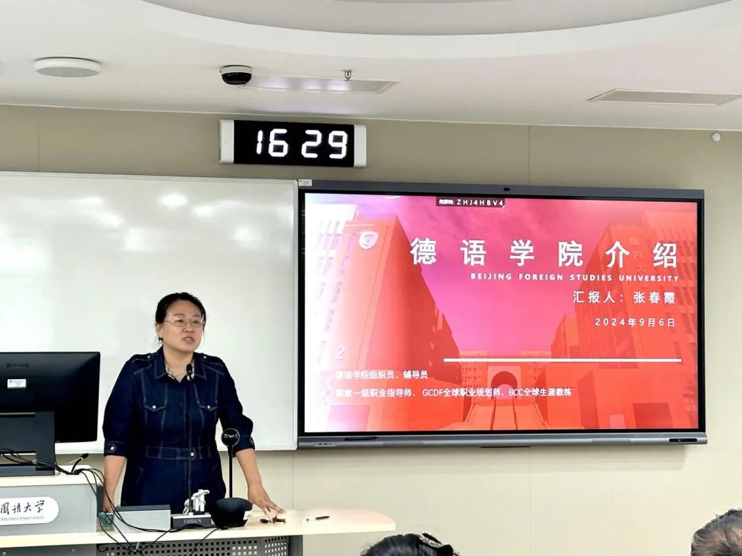 随后,党总支委员、副院长寇蔻详细介绍了Beat365唯一官方网站的基本情况和本科生培养方案。他指出,学院始终致力于培养具有国际视野的复合型人才。对于低年级学生,学院自2023年起启用了全新教材。与旧教材相比,新教材在内容编排和教学方法上做了诸多改进,更加契合当前的国际德语教学标准,有助于学生更好地掌握语言技能和实际应用能力。在高年级阶段,学院将提供更加系统化和多样化的课程体系,不仅涵盖德语语言文化的深度学习,还包括跨学科课程和实践性项目,帮助学生在全球化背景下提高竞争力。