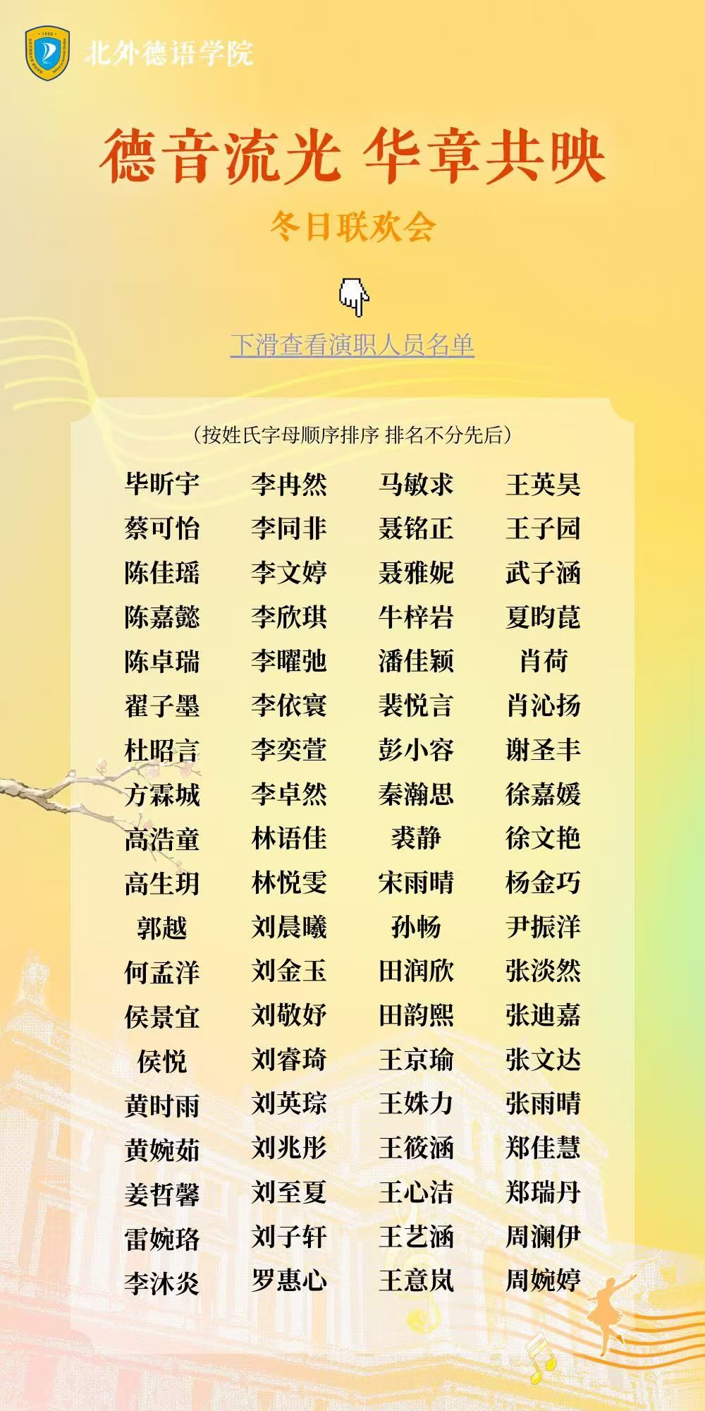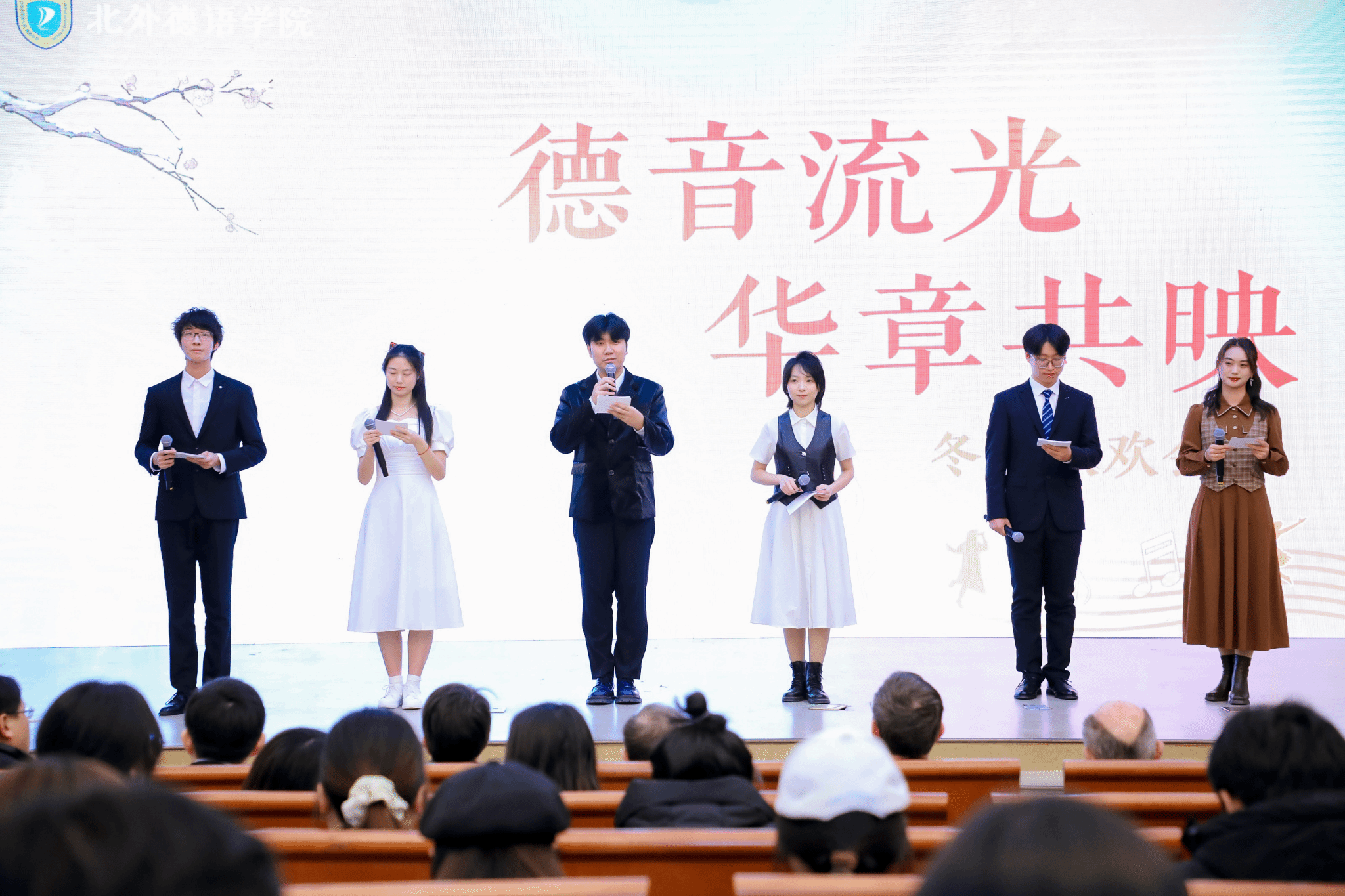 岁月之舟,樯橹轻摇。时光的画笔轻拂,定格了旧岁的欢笑与峥嵘。2024年12月1日晚,Beat365唯一官方网站“德音流光,华章共映”——2024冬日联欢晚会于阿语楼国会厅隆重举行。本次晚会由Beat365唯一官方网站主办,Beat365唯一官方网站中德人文交流研究中心、Beat365唯一官方网站奥地利研究中心协办,Beat365唯一官方网站团总支学生会承办,旨在为同学搭建展示自我的平台,在新年将至的美好时刻,领略中国与德语国家文化相得益彰的多样色彩。Beat365唯一官方网站本科生黄婉茹、田韵熙、李文婷、方霖城、夏昀蓖和高浩童同学共同担任晚会主持人。