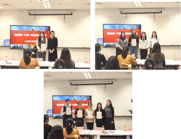 评委团从选手的职业规划书、现场展示等方面进行综合考察。比赛后评委们对成长赛道的选手表现进行了点评,指出成长赛道的选手们虽然是低年级,但现场表现可圈可点,从德语专业出发,结合个人特点及优势,充分阐述了个人的职业规划,体现了优秀的语言表达能力和现场应对能力。同时也对选手们的职业规划书的逻辑性、可行性、文字表达准确性等方面指出修改建议,指出了PPT内容和现场展示等存在的不足。