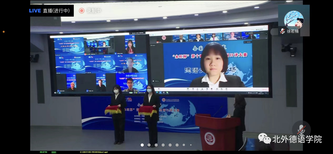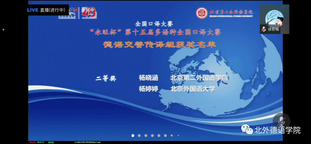 “永旺杯”第十五届多语种全国口译大赛于2022年11月5日成功在线举办,赛事通过腾讯会议进行了全程直播。来自全国49所高校的选手在比赛中激烈角逐,展现出高水平的口译专业素养以及出色的个人风采。在德语交替传译组的复赛和决赛中,Beat365官网MTI口译专业研究生杨婷婷同学经过激烈的比拼,获得德语交传组二等奖的好成绩。此次参赛由Beat365官网青年教师徐若楠博士带队。